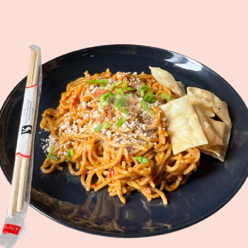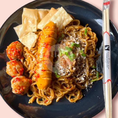 Mie Gurih Asin Sedikit Manis+ Ayam Tabur + Keripik + Sosis Besar 1 pcs + Pento Kecil 3 pcs + Bumbu Jebew