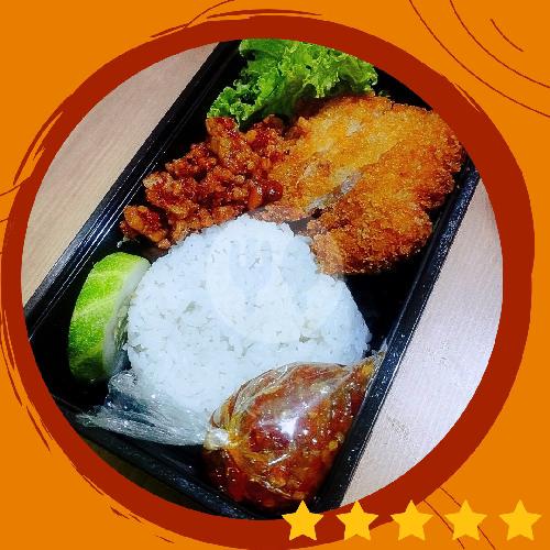 Berisi nasi, ayam katsu, kering tempe, sambal bawang dan lalapan.