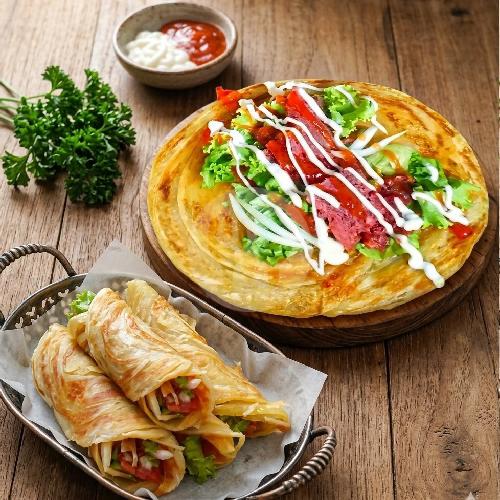 Kenalin nih, inovasi terbaru dari kami: Roti Maryam Gulung Isi Kebab! Bayangin gurihnya Roti Maryam yang flaky dan bertekstur, membungkus melimpahnya Daging Kebab pilihan, segarnya Lettuce Mentimun, serta siraman Pasta Spesial yang meresap.