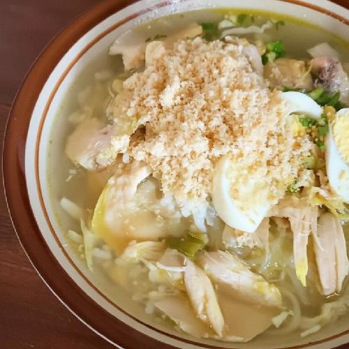Daging ayam PAHA, kulit, jeroan, suun, irisan telur rebus, seledri, dan gubis dalam kuah gurih hangat.
