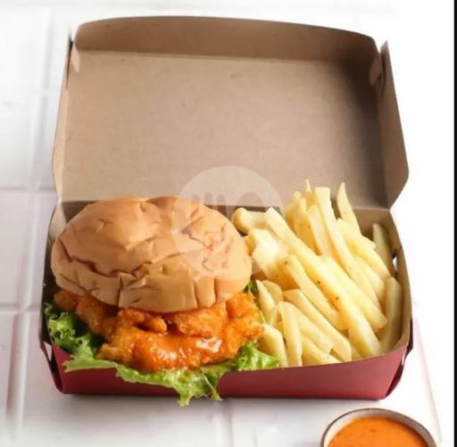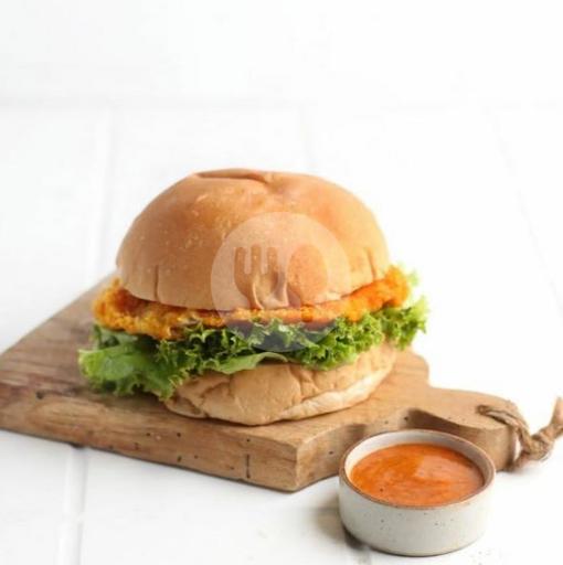 Burger dengan double chicken katsu, sayur dan saus rempah kapoelaga yang khas.
