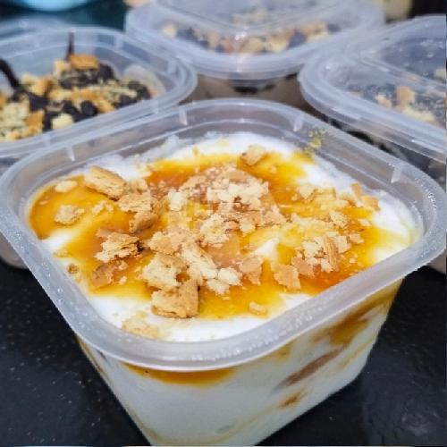 Dessert dari olahan crackers yang dipadukan dengan keju, whippycream, susu dan toping Crumble Caramel (Keep refrigerated). Dimensi Cup:volume 200 ml.ukuran atas 8,5cm x 8,5cm ukuran bawah 6,5cm x 6,5cm tinggi 3,5cm