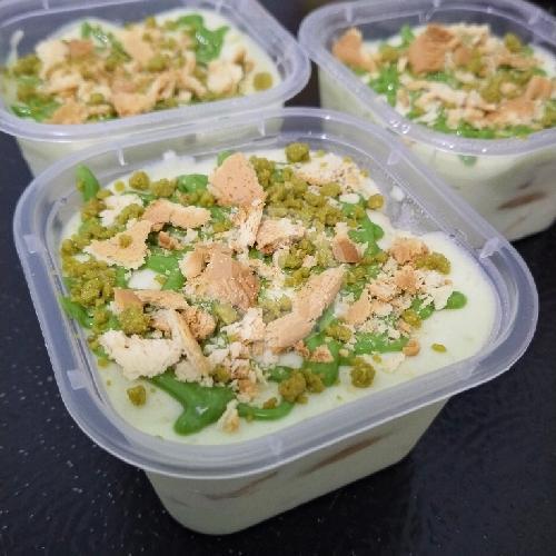 Custard+ Whipcream + Biscuit Regal + Pisang + Glaze Matcha. Ukuran cup: 150 ml