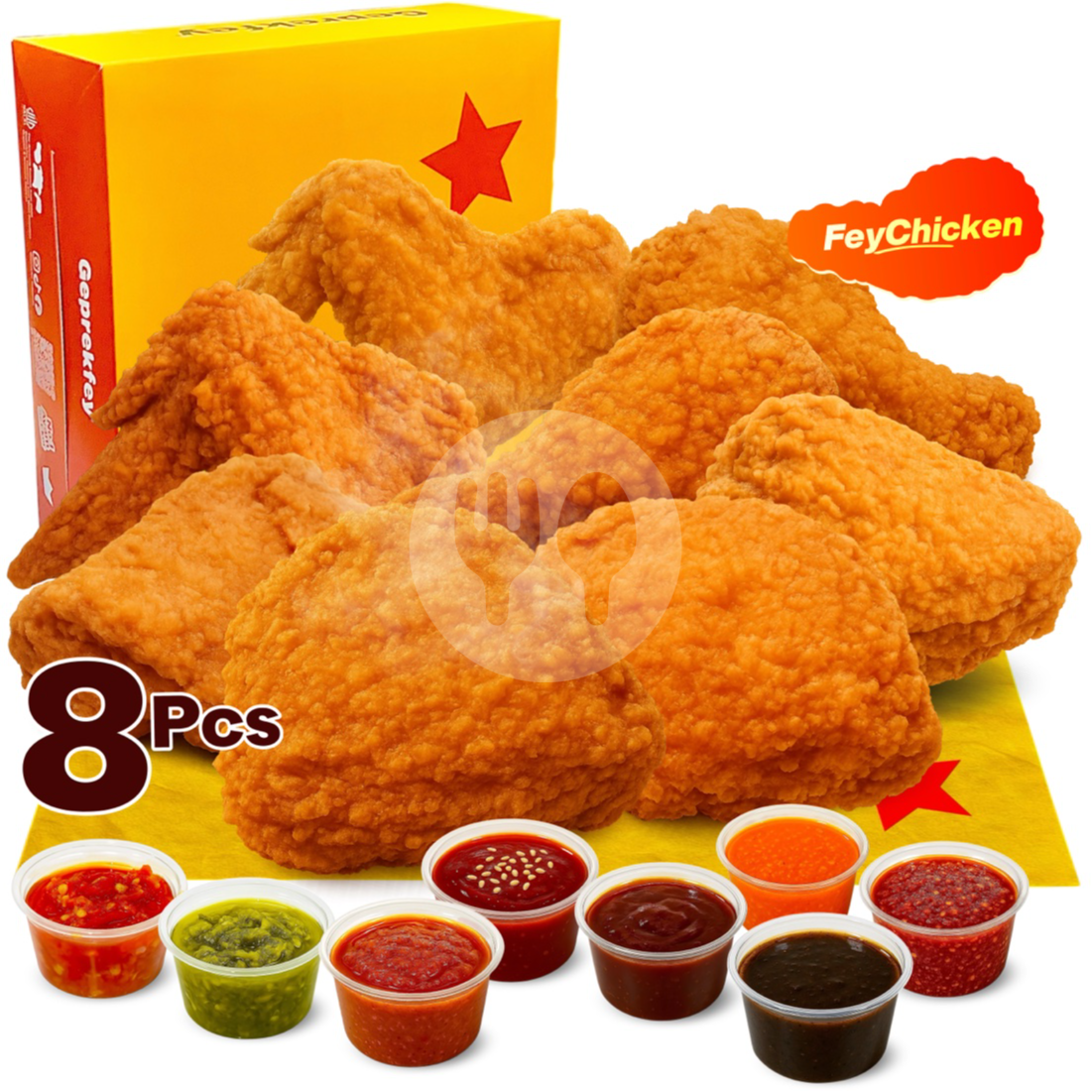 8 pcs feychicken dengan 8 varian sauce - jolado - cabe ljo - malay - korean - smoky bbq - fey - paw -blackfeyper