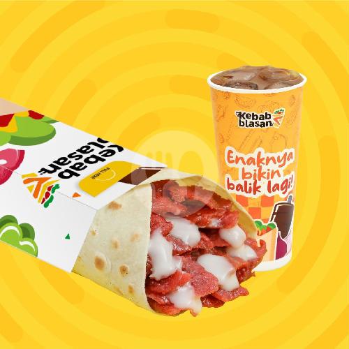 Kebab yang berisi daging sapi, grilled onion, dipadukan dengan saos keju / cheese mayo khas kebabblasan