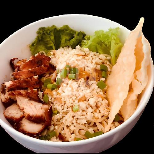 Mie + Taburan Ayam Cincang + Pangsit Rebus + Potongan Ayam Bumbu Khas + Kerupuk Pangsit Daun Bawang Dan Bawang Goreng