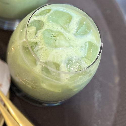 Kopi susu gula aren dengan tambahan sirup dan kacang pistachio