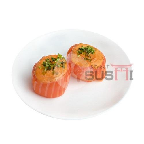 2pcs rice ball wrapped in salmon with mentaiko sauce and ao nori