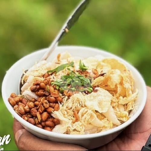Bubur nikmat + ayam suwir + kacang kedelai + daun bawang + bawang goreng + kuah nikmat + kerupuk + sambel