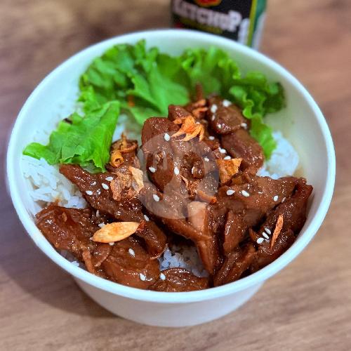 Nasi Dengan Potongan Ayam Saos Teriyaki Di Tambah Dengan Potongan Timun Dan Selada