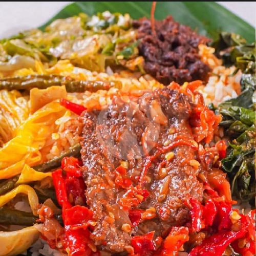 nasi + rendang daging + sayur nangka + sayur daun ubi + sambal