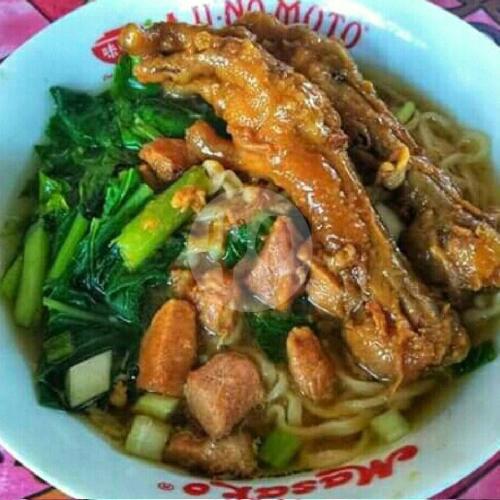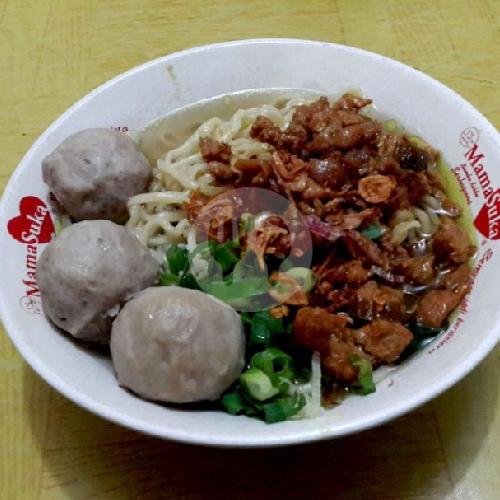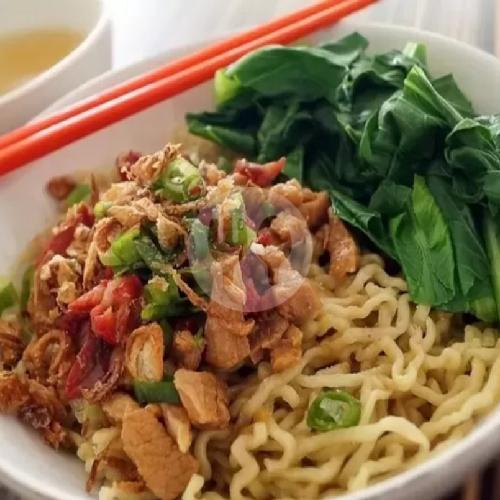Satu porsi mie ayam dengan toping: ayam suwir+sayur hijau+bakso isi 3. Sambal dan kuah di pisah.Free es teh ukuran 12 oz di cup sealer.Foto hanya pemanis buatan