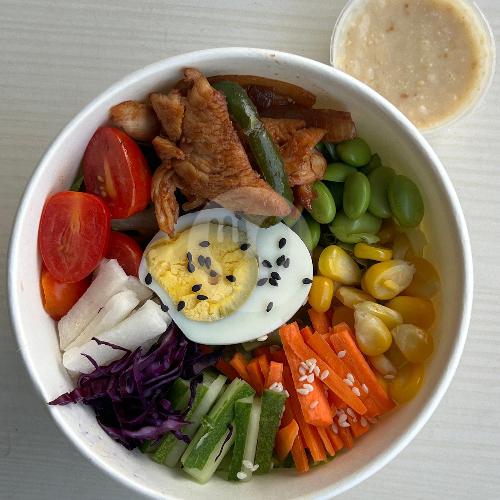 Ayam, Lettuce, Romaine, Selada, Timun, Edamame, Kol Ungu, Jagung, Tomat Cherry, Wortel, Bengkoang, Telur Ayam, Dressing Sauce