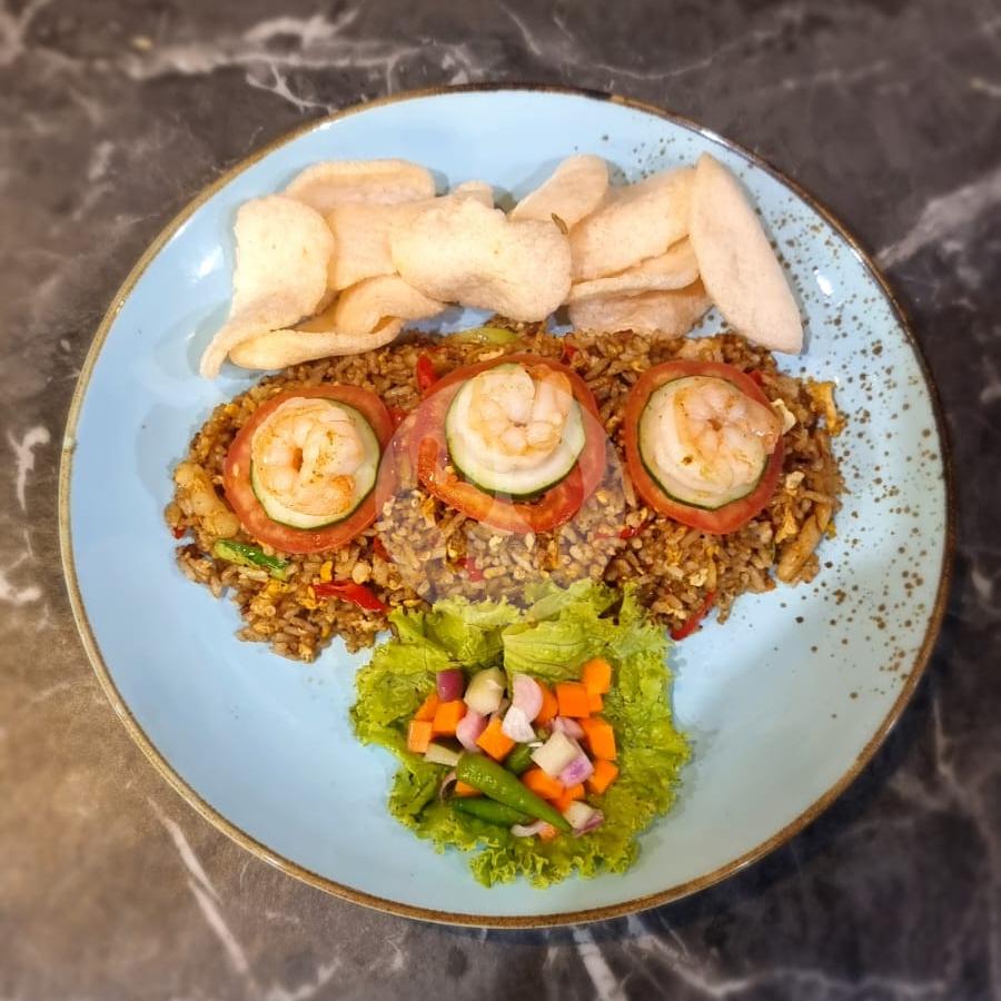 nasi goreng dimasak dengan seafood dan disajikan dengan berbagai macam sayuran dan telur