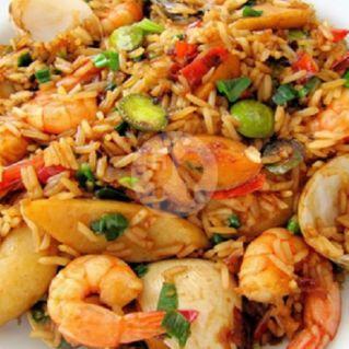 Nasi pilihan+udang+kerang+cumi+irisan ayam+telor+sayuran+bumbu rempah