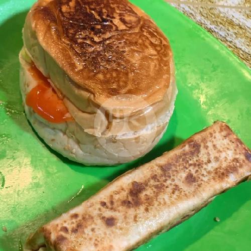 Roti, patty, telur, keju, saos sambal /tomat/mayo