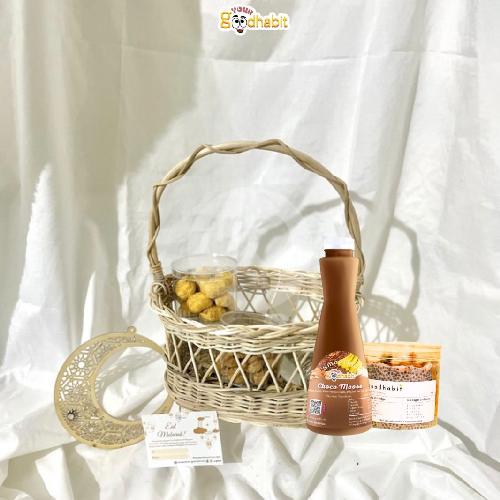 Berisi packaging lebaran dan kartu ucapan, choco moose 320ml, cushy chia pudding, dan 2 pack kue lebaran
