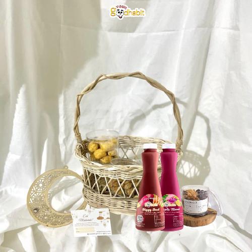 Berisi packaging lebaran dan kartu ucapan, biggy beet 320ml, purple mood 320ml, choco chia pudding, dan 2 pack kue lebaran