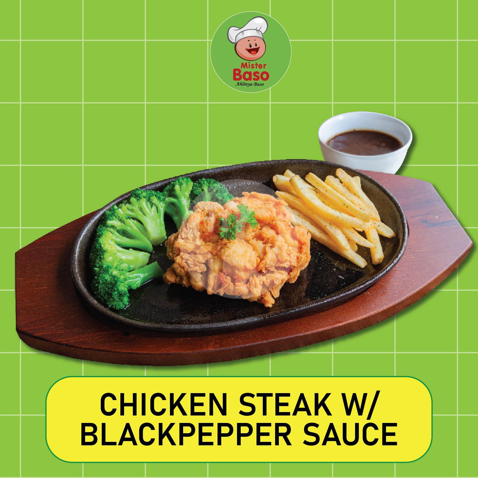 Chicken Steak dari daging paha pilihan (boneless) yang juicy, disiram saus lada hitam hangat.