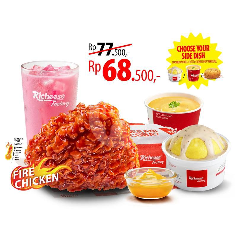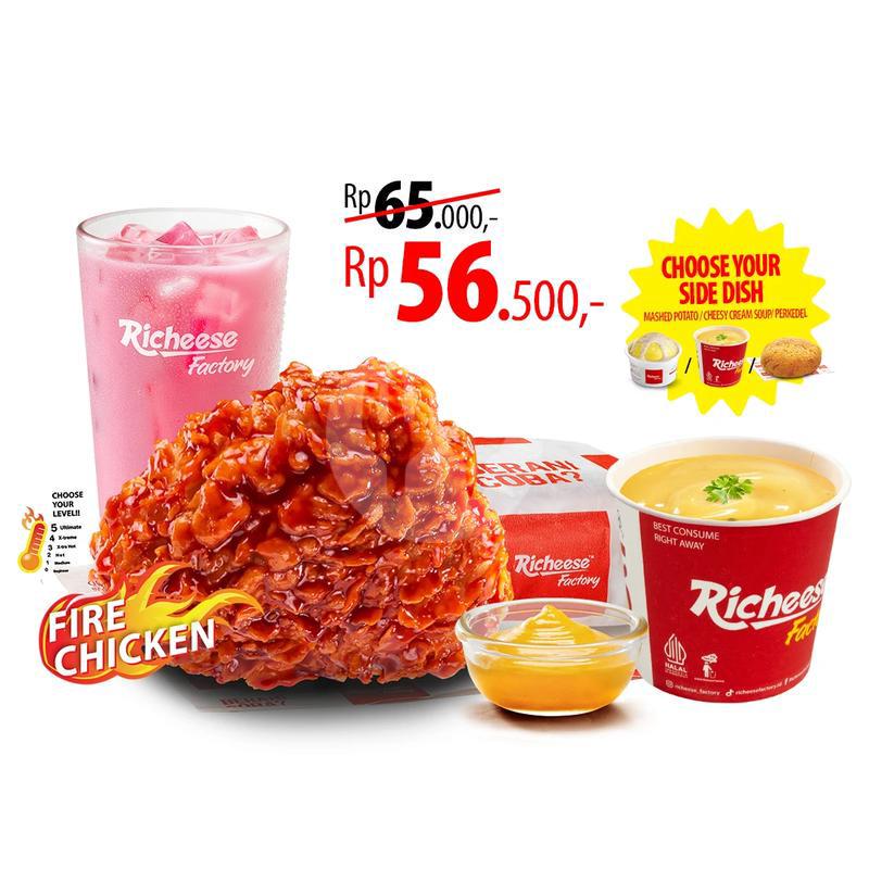 1 Fire Chicken (lv 0-5) + 1 Rice + 1 Medium Drink + 1 Sidedish + Cheese Sauce