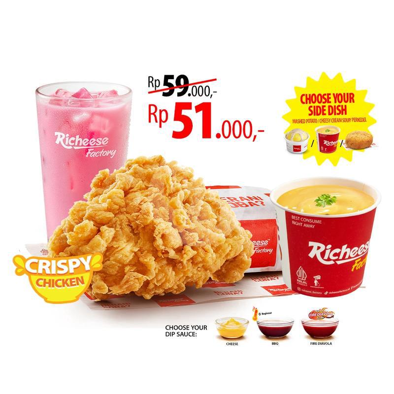 1 Crispy Chicken + 1 Rice + 1 Medium Drink + 1 Sidedish + 1 Sauce (Cheese / BBQ lv 0 / Diavola)