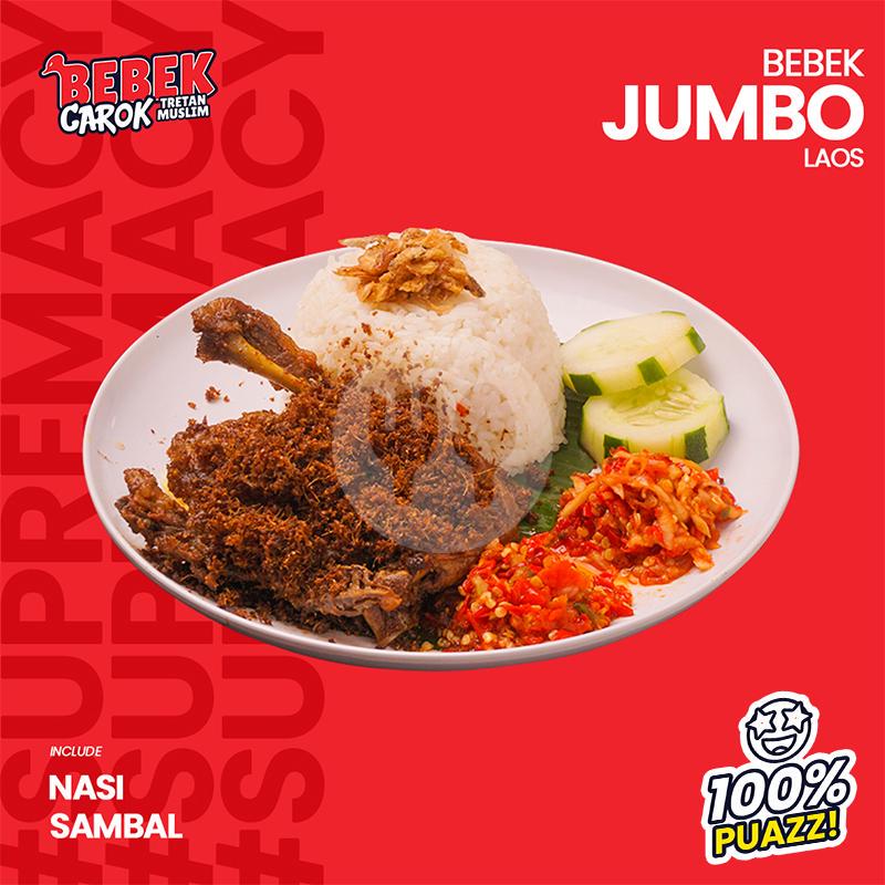 Bebek ukuran besar + nasi + laos + timun + sambal bawang/sambal mangga (pilih satu) + bawang goreng