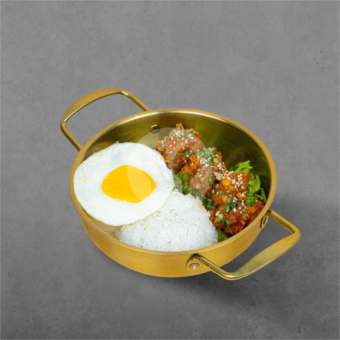 Potongan ayam renyah dibalut saus yangnyeom disajikan di atas nasi hangat dan telur mata sapi.