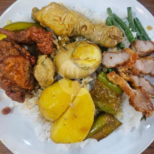 1Nasi,dengan Ayam Kari,kentang,ayam Asam Manis,terong,kacang Panjang,acar Timun Telur,dan Babi Goreng Crispy