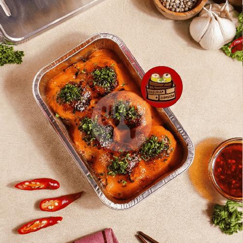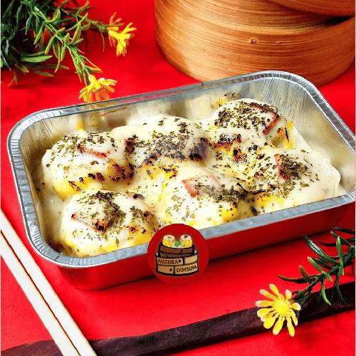 Dimsum yang diguyur Saus Carbonara dan di-torch sampai smoky