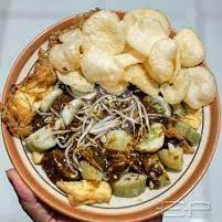 Lontong Yg Dibungkus Daun Ditambah Sayuran Cambah,Kuah Kacang Yg Kental Ditambah Telur Dan Kerupuk