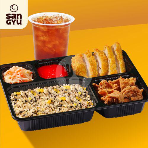 Crispy katsu combo bento FREE sweet ice tea, terdiri dari katsu ayam + kulit ayam crispy FREE es teh manis
