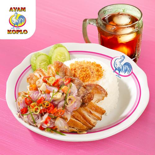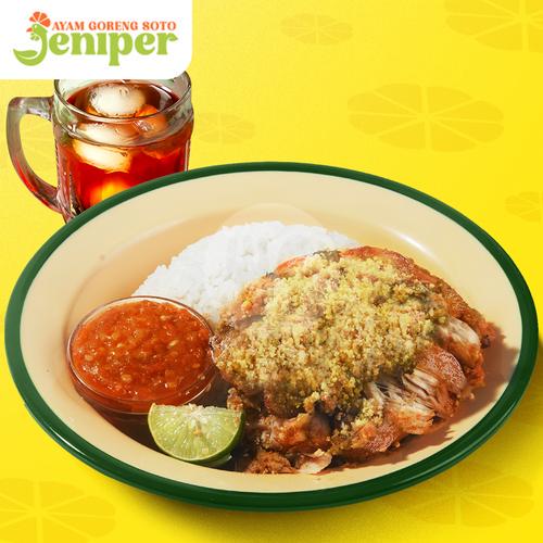 Pelopor Ayam Goreng Soto! 1 Nasi Ayam Goreng dengan bumbu soto koya dan perasan jeruk nipis, lengkap dengan Es Teh Manis & 6 pilihan sambal