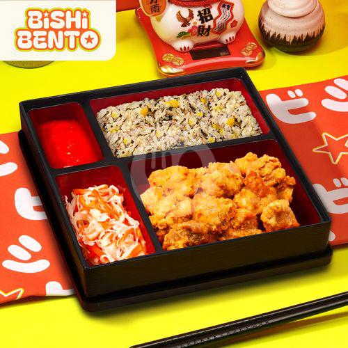 Chicken Karage Bento, karage ayam renyah. Disajikan dengan nasi dan salad.
