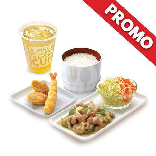 Nasi + Ebi Furai 1 pc + Ebi Fried 1 pc + Shrimp Roll 1 pc + Diced Beef Teriyaki + Chicken Teriyaki + Beef Teriyaki