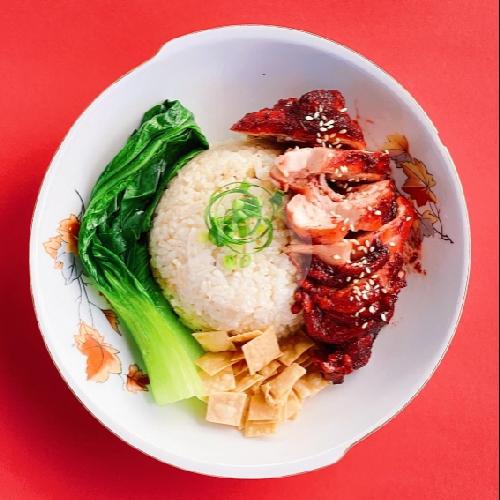 Nasi Hainan Dengan Ayam Charsiu, Pakcoy, Wonton Mini, Lengkap Dengan Kuah Kaldu