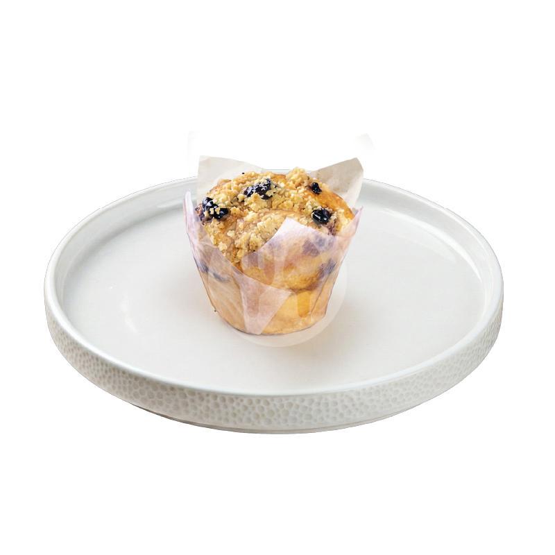 Kue muffin lembut dengan selai blueberry, ditaburi topping crumble