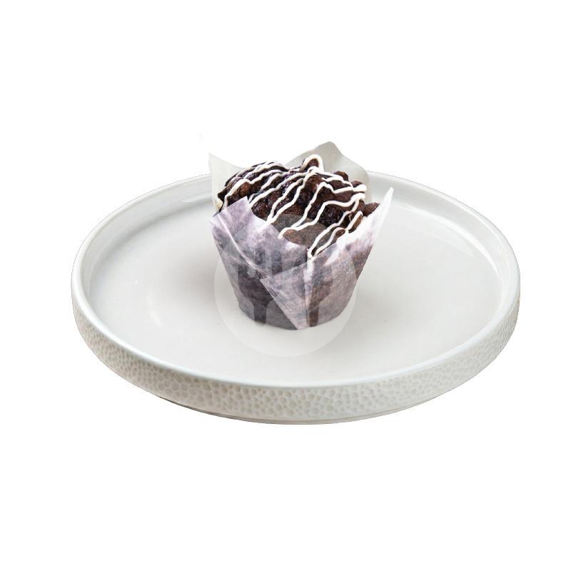 Kue muffin lembut dengan rasa cokelat, ditaburi choco chip dan drizzle icing sugar