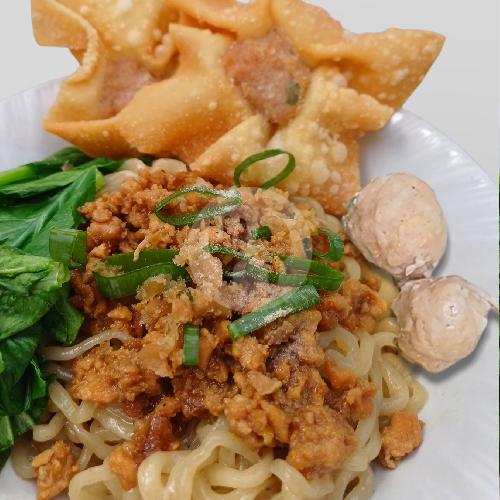 Mie Yang Kenyal Terbuat Dari Telur Bebek Dipadukan Dengan Topping Ayam Gurih Manis Dan Pangsit Yang Bisa Pilih Mau Goreng Atau Basah