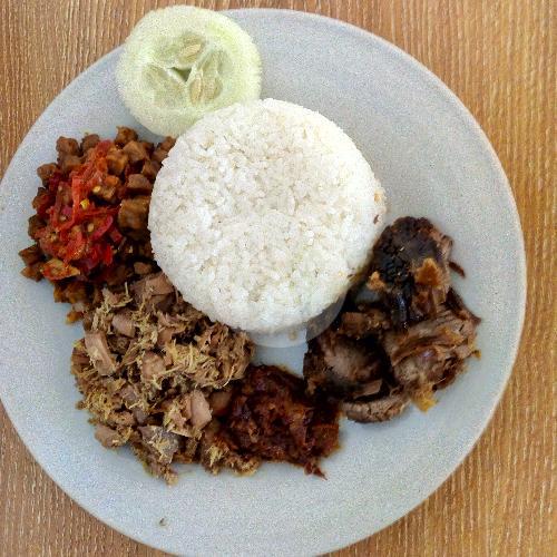 Nasi Putih, Empal, Tahu Tumpang, Srundeng, Gudeg, Sambel Goreng Krecek