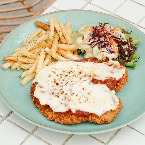 Chicken Breast, Pomodoro Sauce, Mozarella, French Fries, Mix Lettuce