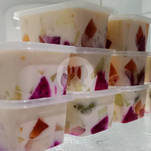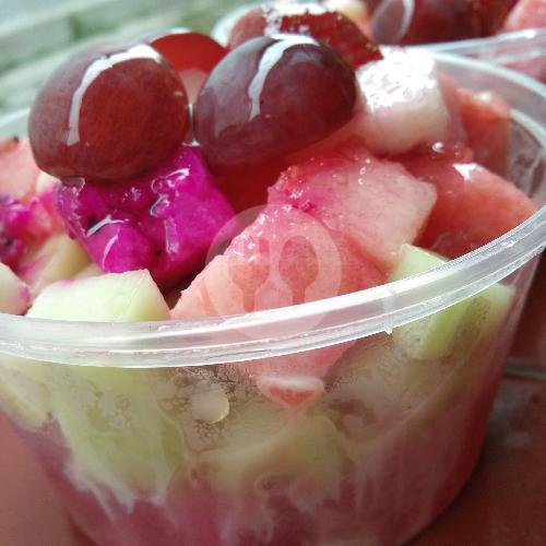 salad buah dengan isian mangga (saat musim) semangka melon apel pir anggur toping jeruk anggur strawberry , jika ingin isian dengan buah naga bisa tambahkan di note