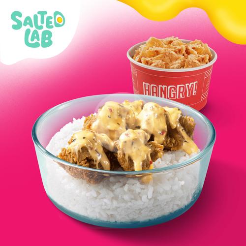 Popcorn Chicken crispy dilumuri saus Salted Egg yang creamy dan gurih, disajikan di atas nasi putih hangat FREE Original Crispy Skin