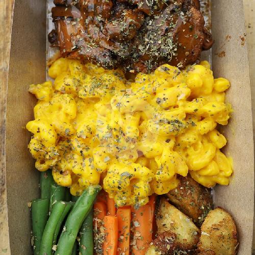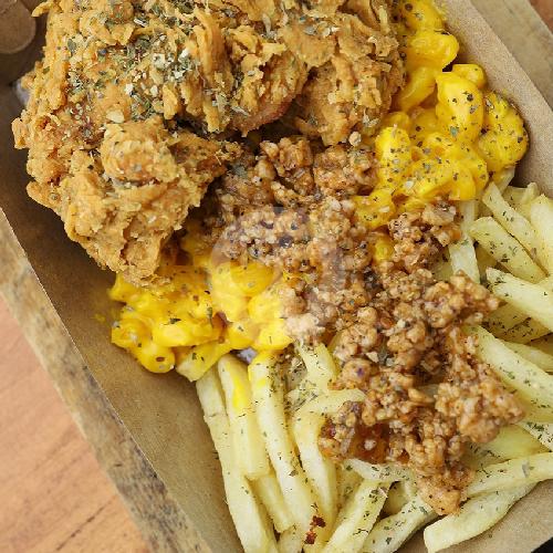 Ayam krispi dengan kentang goreng renyah dan makaroni keju ditaburi ayam cincang blackpepper bikin kenyang seharian!