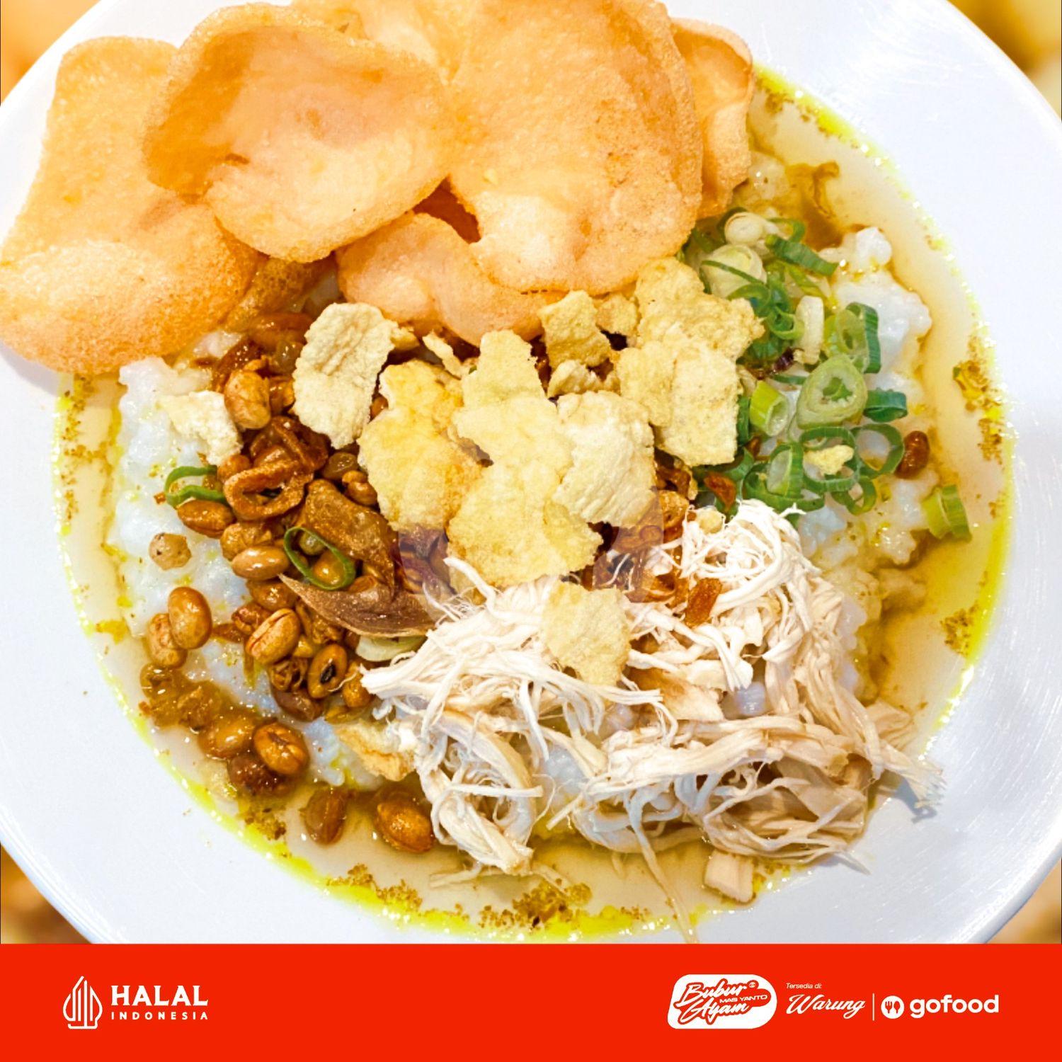 Bubur + ayam suwir + daun bawang + kacang kedelai + bawang goreng + emping + kuah kaldu (dipisah) + kerupuk (dipisah) + kecap manis (dipisah) + sambal (dipisah)