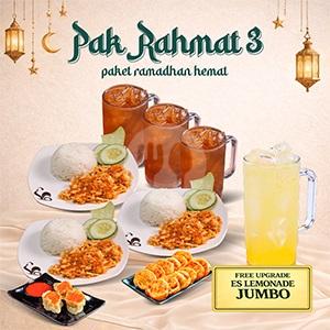 3 Paket geprek + 2 pilihan extra (bakso goreng kering/ bakso goreng spesial/ chicken karage/ chicken wings/ kulit krispi aroma/ otak otak singapore/ siomay ayam udang) + 3 teh manis jumbo