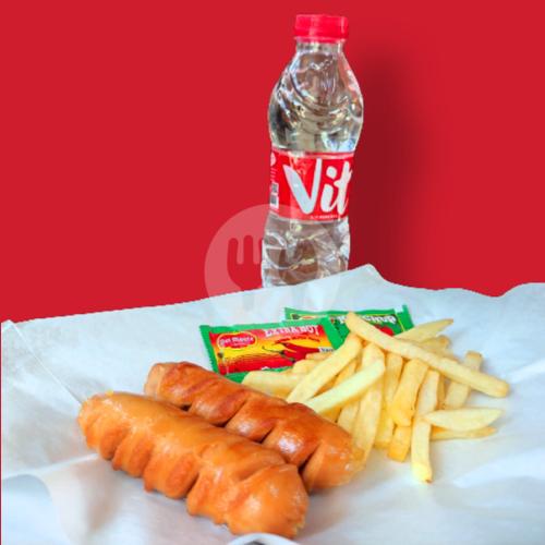 Paket Hemat Sosis Bratwurst + Kentang Goreng/ Frenchfries + Air Mineral 600 ml + Saus Del Monte + Mayones