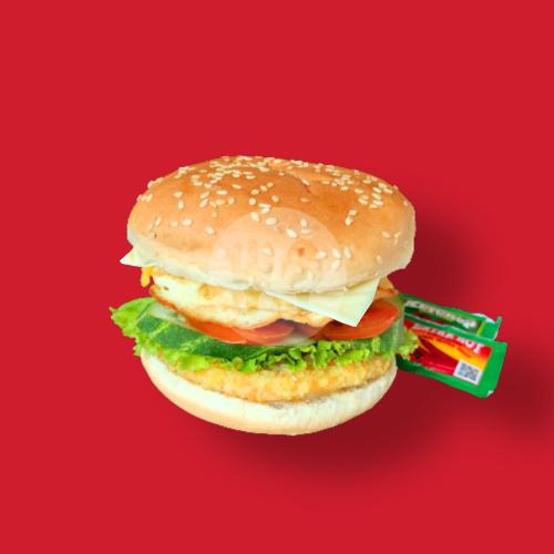 Chicken Burger Dengan Patties Ayam Tebal + Keju Slice/ Cheese + Telor Mata Sapi + Sayuran + Saus Del Monte