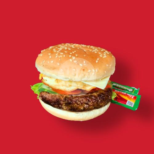 Beef Burger Dengan Patties Daging Sapi Tebal + Keju Slice/ Cheese + Telor Mata Sapi + Sayuran + Saus Del Monte