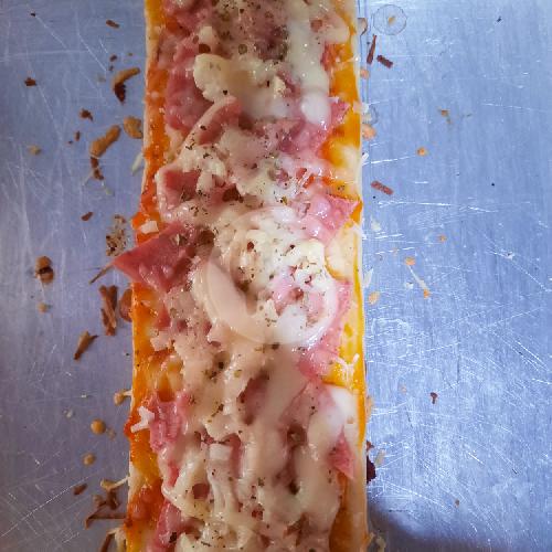 Long pizza Beef Mozarella dengan saus basil , toping smoke beef cincang,bawang bombay dan lelehan dari keju mozarella serta taburan oregano.