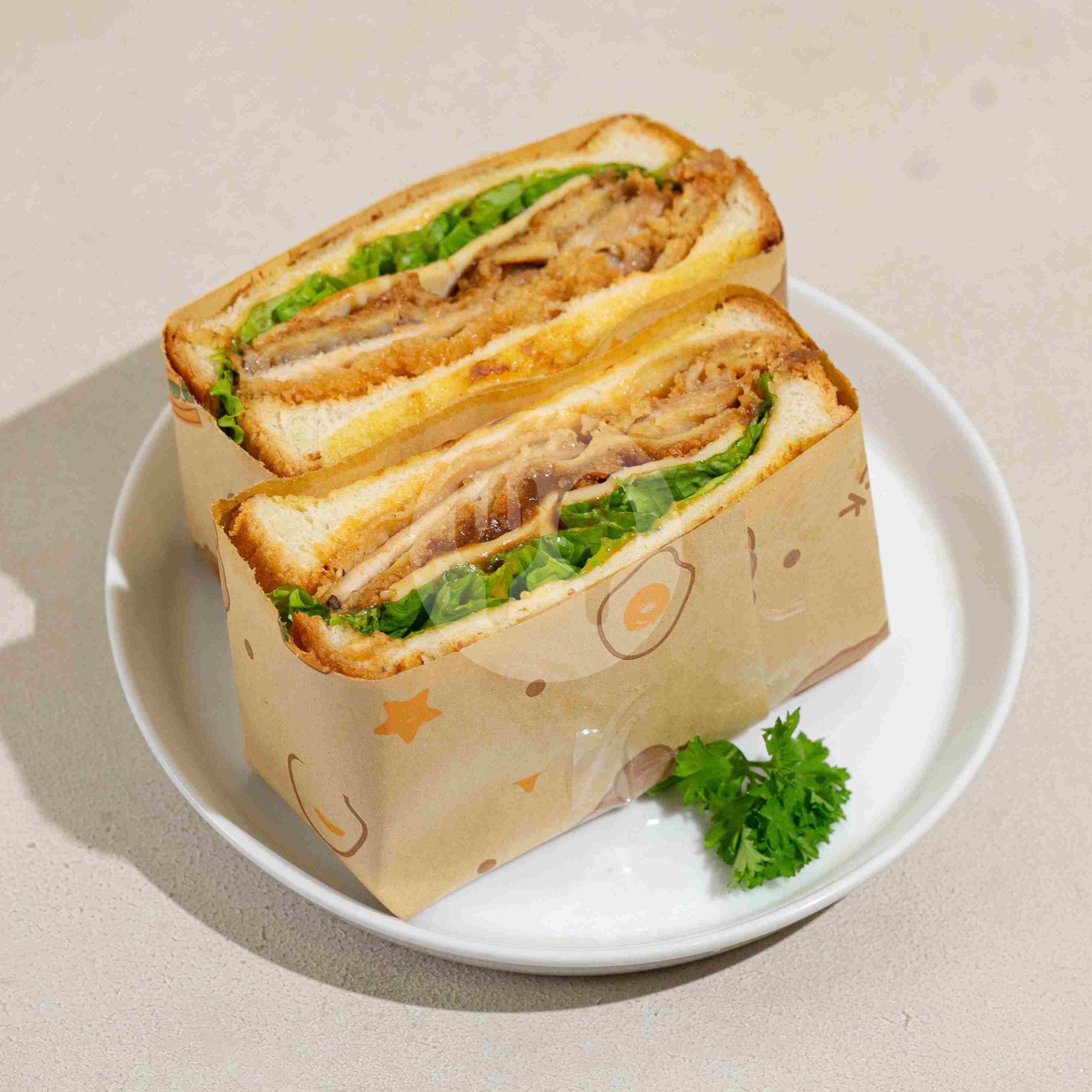 Chicken katsu sandwich dengan isian chicken katsu (paha), keju, sayur, dan saus tonkatsu khas Jepang